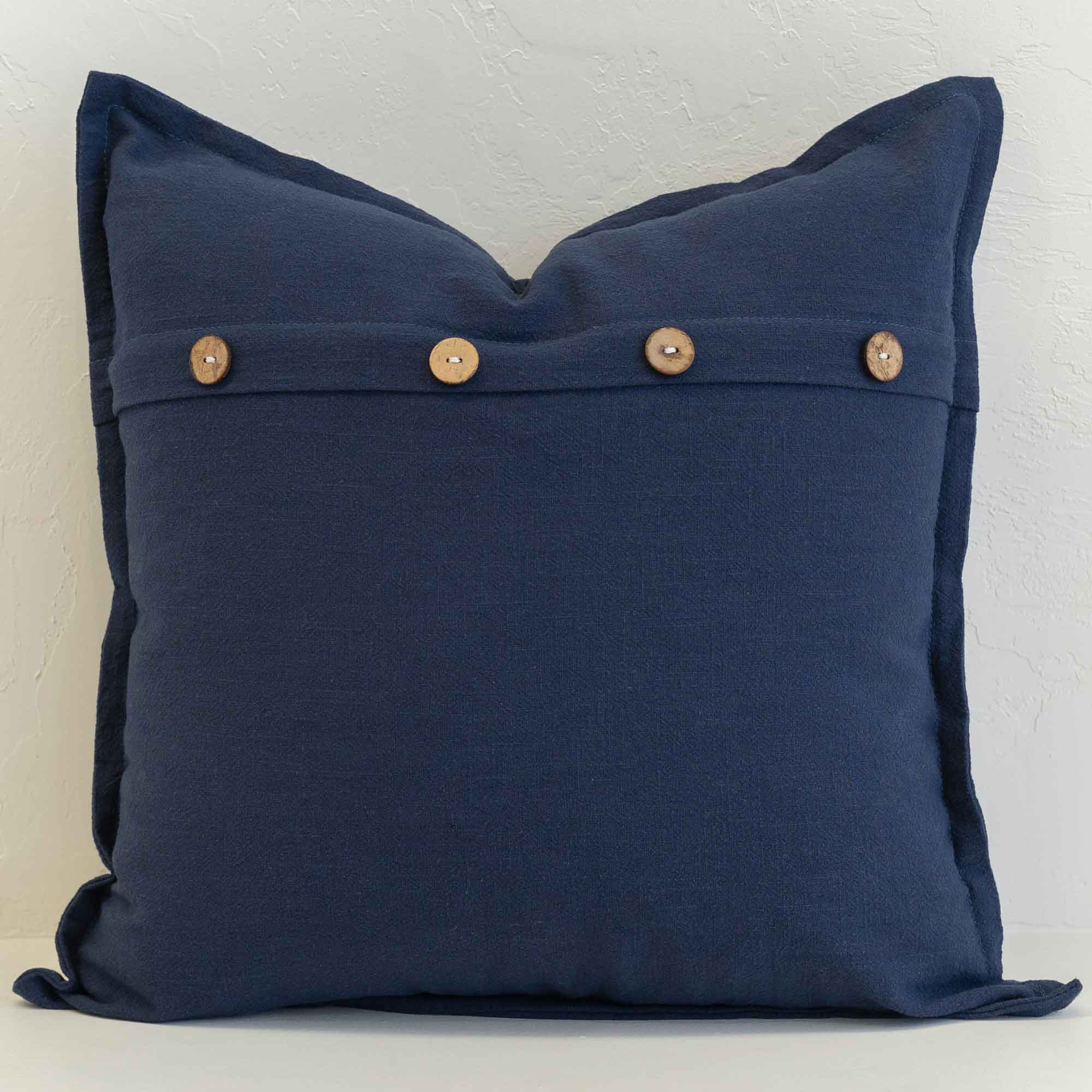 The Navy Linen Button Cushion Cover introduces a deep, classic blue that brings contrast and definition to a layered setting. The natural linen texture adds softness and visual depth, while the decorative button detailing on the back provides a refined design feature. Its smaller size makes it ideal for mixing with larger cushions on sofas, armchairs, or beds.